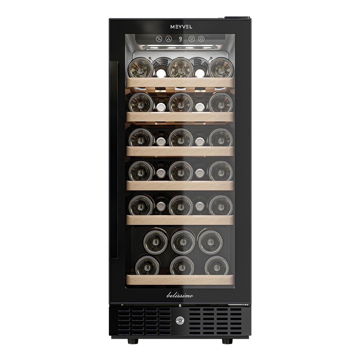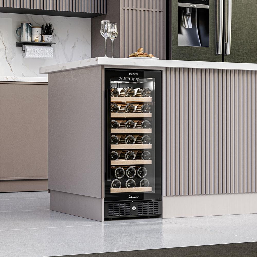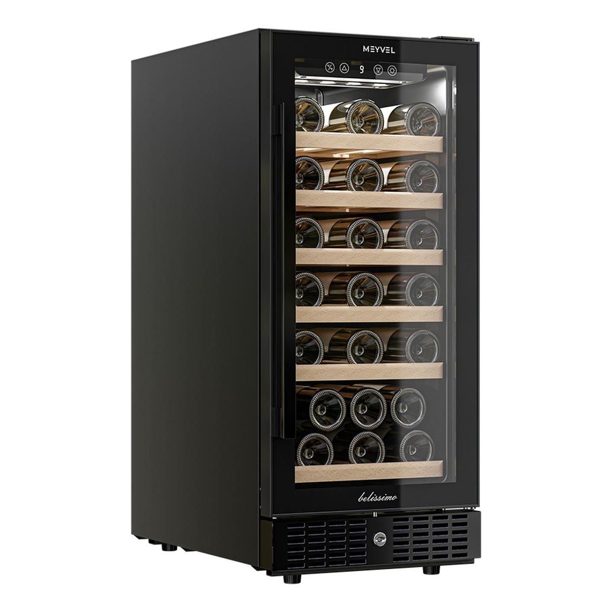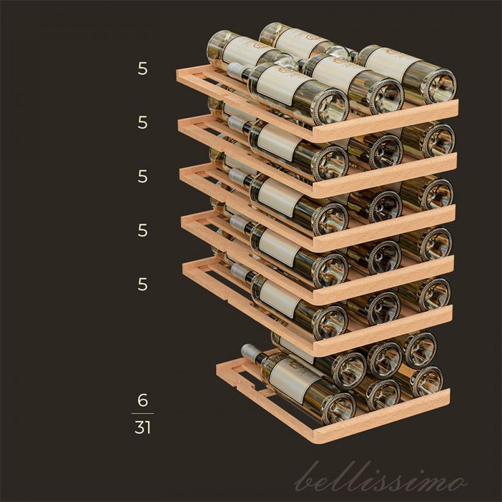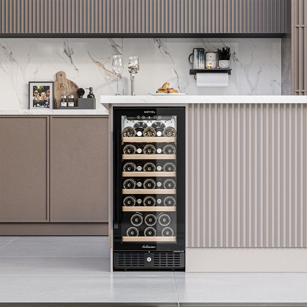 Meyvel MV31BIG-KBT1 вмещает до 31 бутылку типа «Бордо» — это может быть небольшая винотека, тщательно подобранная для особых поводов, или внушительная коллеция. Бутылки располагаются на полках из бука горизонтально, чтобы предотвратить пересыхание пробки. Это не просто эстетика, а практический подход к защите аромата и вкуса напитка.